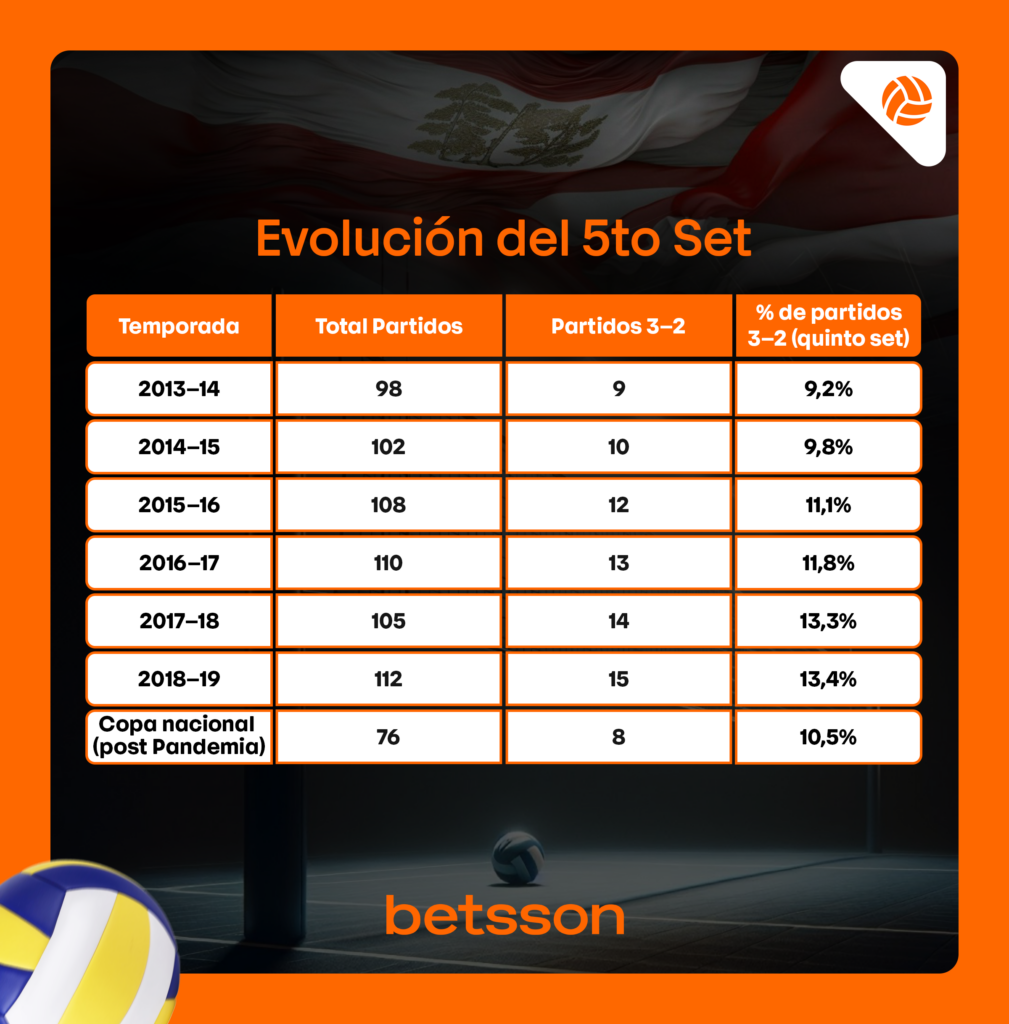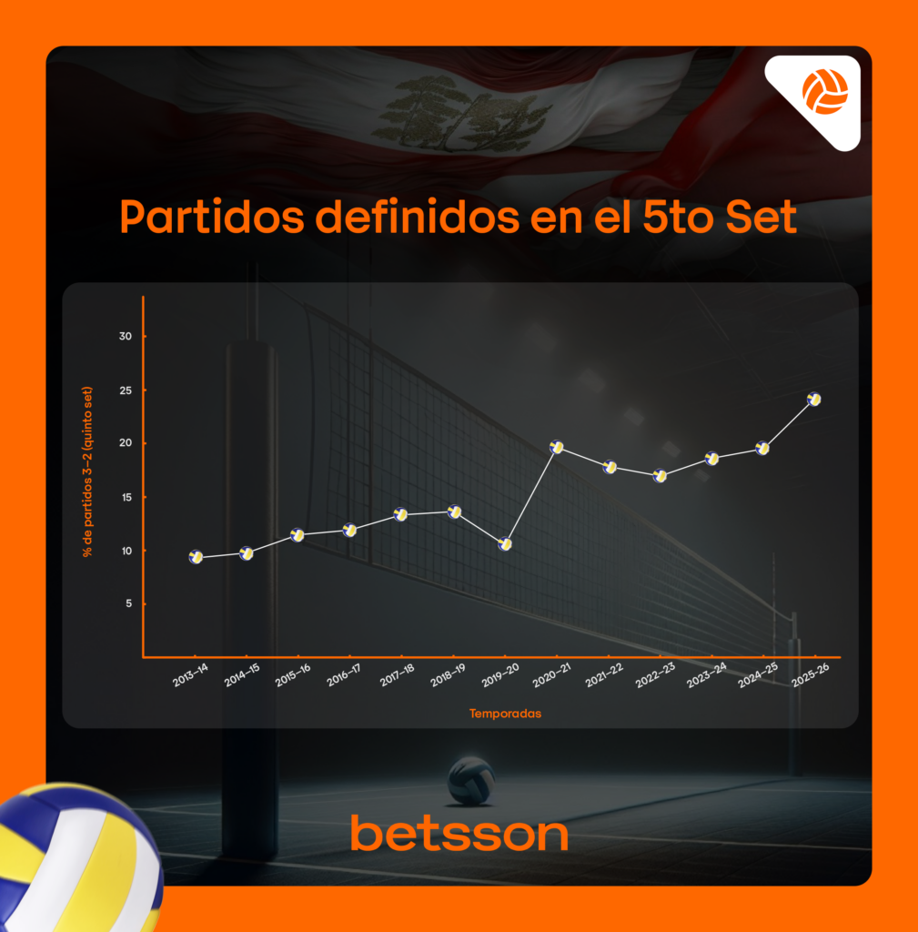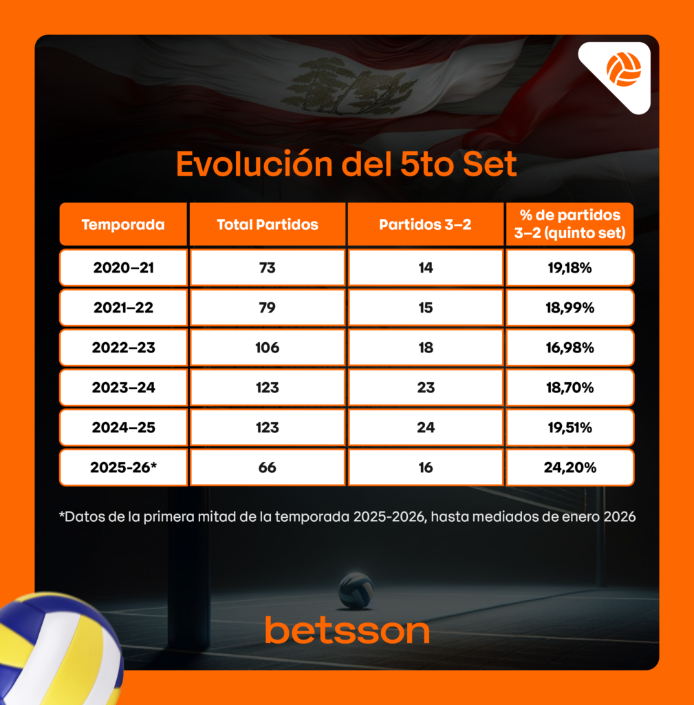 Lo más impactante llegó con la presente temporada 2025-26, que aún se mantiene en desarrollo. Solo en la primera etapa, ya se han jugado 66 partidos y 16 de ellos se definieron en cinco sets, lo que representa un 24.2%, con un promedio de 3.78 sets por partido, el más alto registrado en toda la serie histórica analizada.